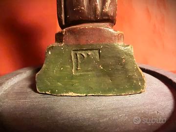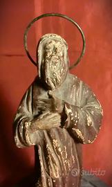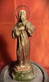 Descrizione: La scultura raffigura San Francesco da Paola, fondatore dell’Ordine dei Minimi, rappresentato in atteggiamento raccolto e contemplativo. Il santo è ritratto in piedi, con il capo coperto dal cappuccio del saio e le mani congiunte sul petto, secondo un’iconografia tipica della produzione devozionale meridionale tra Sette e Ottocento. L’opera mostra una policromia originaria oggi in parte abrasa, con cadute di colore soprattutto lungo il saio, sul capo e sulla base. Il volto, scolpito con una resa stilizzata ma naturale, è conforme allo stile popolare delle botteghe campane attive tra la seconda metà del XVIII secolo e i primi decenni del successivo. L’aureola, realizzata in filo di rame sagomato, presenta un’ossidazione naturale coerente con l’età dell’opera. Il retro della scultura riporta la sigla “P I”, verosimilmente riferibile all’autore o a una bottega, non ancora identificata. Tale prassi era frequente nelle produzioni conventuali o artigianali della Campania in età moderna. Nell’area salernitana tra XVIII e XIX secolo erano attive numerose botteghe minori, spesso monastiche che firmavano con semplici sigle.