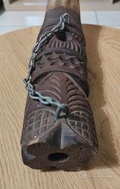 Questo è un corno potorio o un olifante decorativo intagliato a mano,probabilmente ricavato da un corno di bue o bufalo. L'oggetto presenta intagli decorativi dettagliati sulla parte più larga.