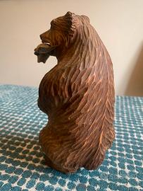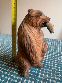 scultura in legno di orso con un pesce, un oggetto da collezione intagliato a mano