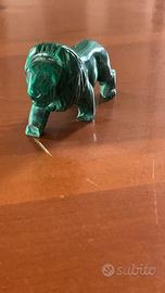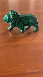 Piccola scultura decorativa in pietra verde, malachite, finemente intagliata a mano e raffigurante un leone in posizione vigile. La pietra presenta le tipiche venature ondulate e le sfumature profonde dal verde scuro al verde più chiaro, che rendono ogni pezzo unico.