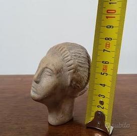 Mini scultura rappresentante un capo di donna. Epoca sconosciuta ma probabilmente contemporanea, materiale pietra/terracotta. Opera verosimilmente attribuita a Lorenzo Pepe (Cassano delle Murge 1916 - Milano 1984). Dietro il capo e sotto la base sono presenti 2 buchi per probabile appoggio su piedistallo.