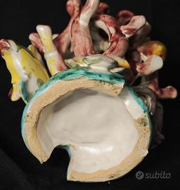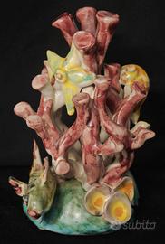 Scultura decorativa in ceramica vietrese, realizzata a mano e ispirata ai fondali marini, databile tra gli anni 70-80 La composizione rappresenta un vivace intreccio di coralli stilizzati, stella marina, pesci, polipo e conchiglie realizzati ed applicati a mano, creando una scena dinamica e ricca di movimento. 📏 Dimensioni • Altezza: 17 cm • Larghezza: 15 cm ✔️ Ottime condizioni generali: non presenta rotture o mancanze. ✅ Spedizione sicura con imballaggio antiurto ✅ Per ulteriori informazioni non esitate a contattarmi Mercatino dell'antiquariato Tiriciclo , Salerno