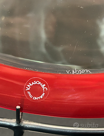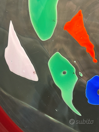Scultura Murano V. Nason & C. - Design Anni 90 - Omaggio a Kandinsky Splendida scultura artistica in Vetro di Murano, pezzo autentico della storica vetreria V. Nason & C. (attiva a Murano tra la fine degli anni '80 e i primi 2000). L'opera è un imponente disco in vetro artistico (diametro 39 cm) con bordo rosso e spettacolari inclusioni policrome fuse (blu, verde, arancio, rosa) e tratti grafici neri. Il design è un raffinato omaggio a Kandinsky e allo stile astratto di Miró. Il piatto è esposto su un supporto in metallo nero dal design moderno, solido e minimale, ideale per arredamento vintage e contemporaneo. Scheda Tecnica: Manifattura: V. Nason & C. (presente etichetta originale "V. Nason & C. Murano Italy" sul vetro). Stile: Design Anni 90 / Modernariato. Dimensioni Piatto: Diametro 39 cm. Dimensioni Base: Altezza 10 cm x Profondità 10 cm x Larghezza 14,8 cm. Condizioni: L'oggetto è in buone condizioni generali. Presenta alcuni lievi segni del tempo coerenti con l'età del pezzo, che ne testimoniano l'autenticità e sono stati documentati nelle foto. Nessuna sbeccatura o crepa strutturale. Un pezzo di alto artigianato veneziano, perfetto per valorizzare saloni di rappresentanza o per collezionisti di vetri d'arte del XX secolo. 💰 Prezzo: 100 € 📍 Solo Ritiro a mano in loco su Roma zona EUR >> NO SPEDIZIONE << 💬 Disponibile per informazioni