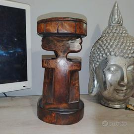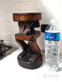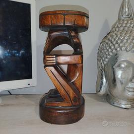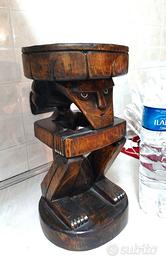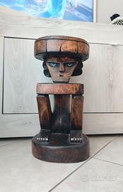 Scultura a sgabello etnico con figura africana scolpita in legno massiccio. Dimensioni 40 cm altezza x 20 cm larghezza seduta. Bellissimo oggetto d’arredo bohemien, anche per appoggiarci sopra un vaso con pianta. Oggetto etnico / artistico da collezione.