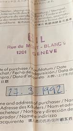 Orologio Swatch Gent vintage, originale Swiss Made, anno 1992. Modello elegante con cassa dorata, quadrante bianco minimal con numeri romani e dettagli raffinati, impreziosito da un piccolo motivo decorativo centrale. ✔️ Originale Swatch anni ‘90 ✔️ Perfettamente funzionante (batteria nuova se sostituita) ✔️ Cinturino in pelle nero stile lucertola ✔️ Completo di certificato di garanzia originale ✔️ Data di acquisto: 27/03/1992 – Ginevra 🔹 Movimento al quarzo 🔹 Cassa color oro 🔹 Design classico ed elegante 🔹 Condizioni molto buone per l’età 🔹 Normali segni del tempo (vedi foto) Orologio ideale per: •Collezionisti Swatch vintage •Chi cerca un modello elegante anni ’90 •Regalo raffinato e originale 📦 Spedizione accurata e tracciata 📸 Foto reali dell’oggetto