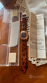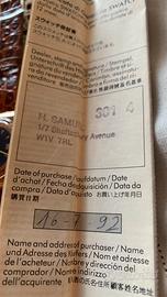 Orologio da polso Swatch P.D.G. GX122, originale Swiss Made, anno 1992. Modello vintage dal design elegante e distintivo, con cassa color rame e quadrante nero arricchito da dettagli dorati e anello interno arancione. ✔️ Mai indossato (NOS) ✔️ Perfettamente funzionante – batteria nuova ✔️ Cinturino originale in pelle effetto coccodrillo ✔️ Scatola originale Swatch inclusa ✔️ Garanzia originale datata 16/07/1992 🔹 Movimento al quarzo 🔹 Dimensione cassa: circa 34 mm 🔹 Condizioni generali eccellenti per l’età 🔹 Lievissimi segni sul cinturino dovuti al tempo (vedi foto) Orologio ideale per: •Collezionisti Swatch anni ’90 •Amanti del vintage originale •Chi cerca un pezzo elegante e non banale 📦 Spedizione accurata e tracciata 📸 Foto reali dell’oggetto in vendita