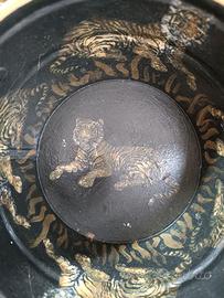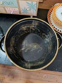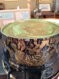 Piccolo secchiello decorativo in stile vintage. presenta un motivo a tigre con finiture dorate con un aspetto rustico, antichizzato. realizzato in metallo. Può essere utilizzato come fioriera, portaoggetti o semplicemente come elemento decorativo. Presenta piccoli segni di usura, ma nulla di importante.