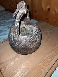 Antico secchiello globulare in ferro da pozzo. Considerando l'età (del 1800) e l'utilizzo non è messo male (vedi le foto). Ha un foro sul fondo e all'interno su parte delle pareti sembra avere contenuto sabbia/cemento, penso che sia abbastanza facilmente pulibile (forse con una sabbiatrice??). Visto in vendita a vari prezzi anche esagerati (alcuni la datano al 1400/1500 circa). Vendo a 40 euro più spese spedizione che al momento non conosco. Misure alt. circa 22 cm, diametro maggiore 14 cm circa, peso 1 kg. Spedirei per posta, meglio sarebbe se abitate in zona Treviglio e lo ritirate a mano.