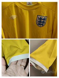 Seconda maglia portiere Inghilterra, anno 2010, marca Umbro, made in Indonesia, in tessuto misto poliestere, cotone ed elastane, tg 42 equivalente ad una L circa (ascella 54,5 cm circa; altezza davanti 70 cm circa; dietro 75 cm). PRESENTA UN PICCOLO SEGNO DI SPORCO IN BASSO (VEDASI DETTAGLI FOTO). Lo stemma nazionale della federazione e la stella sono ricamati in tessuto e termosaldati. Il logo Umbro davanti è ricamato in filo bianco in rilievo. Articolo originale dell'epoca, poco usato è in ottime condizioni generali e ben conservato.