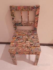 Una piccola sedia di legno rivestita tutta in fumetti di Topolino. Le misure sono circa 57 x 30 x 27 cm. Si può usare come oggetto di arredamento, come sedia per bambini, poiché è messa in buone condizioni ed è solida, altrimenti come un ottimo oggetto per collezionisti di Topolino.