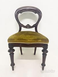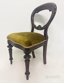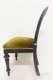 Sedia inglese con struttura in mogano scuro e rivestimento in velluto verde. Disponibili 7 sedie Dimensioni: L50x x P44 x H90 cm Richiesta: ?90,00 CADAUNA