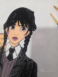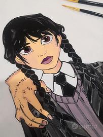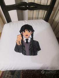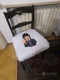 Sedia Rustica in Legno con seduta disegnata a mano dal design intramontabile, resa unica da un rivestimento personalizzato ispirato alla celebre "Mercoledì Addams" Perfetta per gli amanti dello stile gothic-chic o per arredare con originalità una cameretta. Caratteristiche Principali: Struttura: Realizzata in legno massiccio con finitura scura (nero), solida e resistente. Lo schienale presenta un elegante motivo a doppia onda che richiama lo stile rustico tradizionale. Rivestimento imbottito in tessuto bianco di alta qualità, decorato con una fan art originale di Mercoledì Addams e l'immancabile "Mano" sulla spalla.