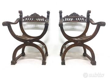Sedia "Savonarola" realizzata interamente in noce italiana. Provenienza: Italia Epoca: fine '800 Dimensioni: L55 x P54 x H82 cm Richiesta €550 cad Per la coppia: €1100,00