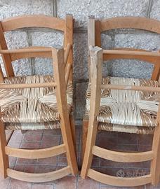 4 Antiche sedie in legno massello con seduta in paglia rustiche arte povera.