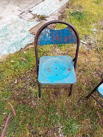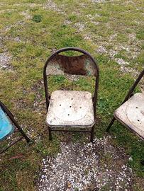 AI Mode Tutti Corrispondenze esatte Immagini corrispondenti    7 siti Le sedie mostrate nell'immagine sono sedie pieghevoli vintage in metallodallo stile industriale, caratterizzate da una struttura tubolare e una seduta e schienale in lamiera. Questi modelli sono spesso risalenti alla metà del XX secolo (anni '50-'60) e presentano una finitura usurata o patinata che ne esalta il carattere antico. Pamono.it+3 Caratteristiche Principali Materiale:Realizzate interamente in ferro o acciaio, talvolta con sedute traforate o sagomate per il comfort. Design:Presentano uno schienale curvo a "ferro di cavallo" e gambe a X che permettono di ripiegarle facilmente per riporle in poco spazio. Stile:Vengono spesso descritte come sedie "industrial" o "shabby chic", ideali per arredare giardini, verande o cucine dallo stile retrò.