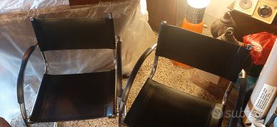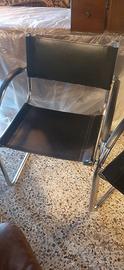 Disponibile > cedo in coppia 2 sedie/poltrone gemelle retro' mod."cantilever" (a sbalzo ) risalenti a gli anni 70/80 - sono un "made in italy" orginali dell'epoca con struttura telaio in tubolare d'acciaio cromato a specchio e basi a sbalzo continua che funge da bracciolo , sedute, schienali e copri braccioli in cuoio nero teso sulla strutture metalliche - lo stile del design e' riconducibile al modernismo di Marcel Breuer -seduta misura 45