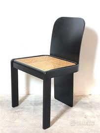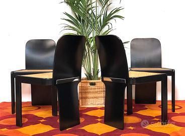 Set di 4 Sedie Vintage Anni 70 , le sedie sono state disegnate da Pier luigi Molinari e prodotte da Pozzi negli Anni 70. Completamente restaurate a nuovo,la struttura è realizzata in legno curvato a vapore e verniciata a forno in nero opaco,seduta in Paglia di Vienna. Le sedie sono di un design unico,è presente un caratteristico dettaglio cromato sul retro schienale che le rende incredibilmente Eleganti e aggressive. CONDIZIONI PERFETTE Misure: Altezza cm 80-Larghezza cm 48-Profondità cm 48-Seduta cm 46x46-Altezza seduta cm 40