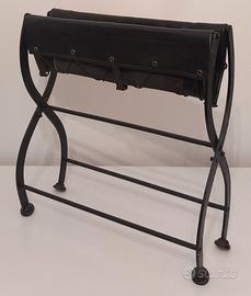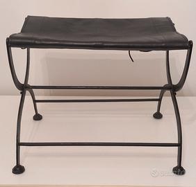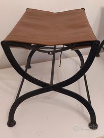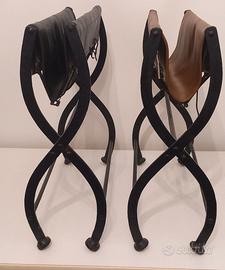Coppia di sedili / sgabelli pieghevoli realizzati in ferro battuto con seduta in pelle. Sono stati ritenuti di probabile origine militare con funzione di sedute o comodini da campo.