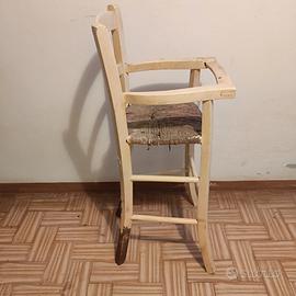 Seggiolone per bambini vintage anni 50 in legno con la seduta impagliata
