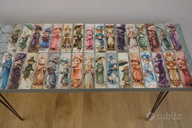 Serie di segnalibro composta da 32 pezzi tutti diversi. Provenienti dalla mia collezione. Soggetto: “Criceto e Topo”. Immagini molto carine e simpatiche. Colori pastello. Sono in cartoncino. Illustrato su un lato, bianco sul retro. Un‘idea regalo originale sia per adulti che per bambini: - perfetto per chi ama leggere (utile per segnare la pagina a cui si è interrotta la lettura). - un simpatico pensiero da aggiungere al dono di un libro (magari con dedica scritta sul retro che è bianco). - ogni singolo segnalibro può essere utilizzato come bigliettino da scrivere sul retro per accompagnare un qualsiasi regalo (di compleanno, Natale, ricorrenze varie, ecc.) - simpatico e utile gadget per feste, inviti, ecc. - bellissimo pezzo da collezione per chi colleziona Ephimera. Condizioni : i segnalibro sono perfetti. Come nuovi. Li ho conservati nell’apposito raccoglitore. Ho altri segnalibri da vendere. Doppioni e non.