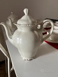 Il servizio è di fine porcellana tedesca color panna con bordatura e decori in oro .