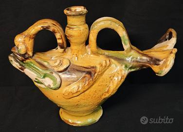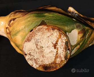 Orcio in ceramica smaltata a forma di pesce stilizzato, riconducibile alla tradizione della ceramica popolare di Seminara (Calabria).