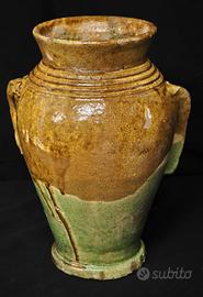Il vaso presenta un volto maschile a rilievo, modellato a mano con forte espressività plastica, nei tipici smalti colanti giallo/verde della ceramica calabrese.