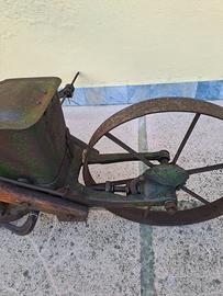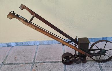 Vendo seminatrice manuale d'epoca, attrezzo agricolo antenato delle seminatrici trainate, completo di barra metallica laterale per regolare la distanza tra le file.