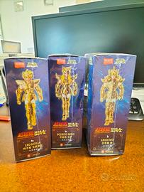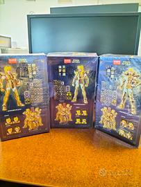 Set di 3 action figure Champion Class di Saint Seiya. - Personaggi inclusi: Leo Aiolia, Scorpio Miro, Aries Mu. - Armature dorate dettagliate. - Scatole originali incluse.