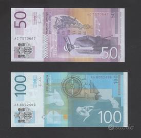 Vendo due banconote della Repubblica di Serbia. 50 dinara 2011 ( P- 56a AU) 100 dinara 2013 ( P-57b AU)