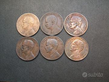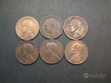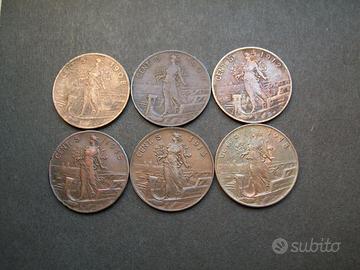 Lotto di 6 monete in rame da 5 centesimi donna su prora.