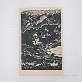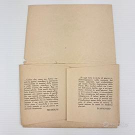Queste cartoline appartengono a un’iniziativa celebrativa e propagandistica del regime fascista. L’obiettivo era onorare la figura del medico militare italiano, rappresentato come eroe al fronte e nella società civile. Le illustrazioni mostrano scene drammatiche di guerra, assistenza ai feriti, ospedali da campo, mezzi della Croce Rossa, e medici impegnati sia al fronte che nelle retrovie. Si notano forti richiami retorici al sacrificio, all’abnegazione e al patriottismo.Elementi ideologici: la presenza di citazioni di Mussolini e D’Annunzio sottolinea la volontà di legittimare il sacrificio medico come parte integrante del mito della “grande guerra” e della missione nazionale. Sono una testimonianza preziosa della cultura visiva e della propaganda italiana tra le due guerre, con particolare attenzione al ruolo dei sanitari.