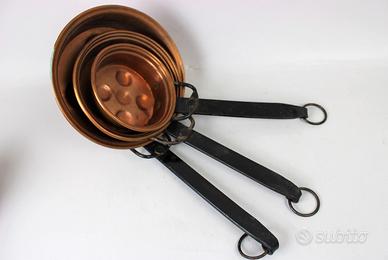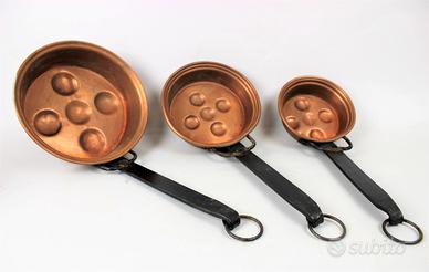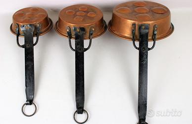3 stampini di diverse misure, a forma di tegame con incavi per dolci o tortini e con manici in metallo brunito.