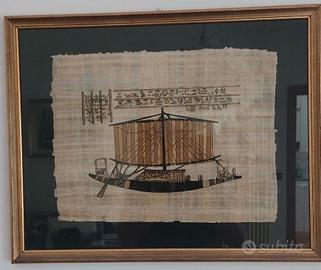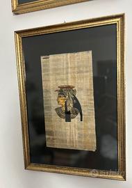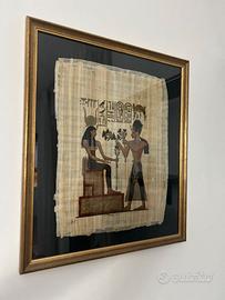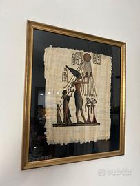 Magnifico set di cinque dipinti originali su papiro egizio, provenienti dall'Egitto. Ogni papiro è stato incorniciato con una elegante cornice dorata e protetto da un vetro trasparente, garantendo la conservazione e l'esaltazione della bellezza di questi dipinti. Immagina di aprire una finestra sul tempo, di portare nella tua casa non semplici dipinti, ma veri e propri frammenti dell'Antico Egitto. Dipinti a mano con pigmenti naturali che ne preservano i colori vividi e l'autenticità. La trama fibrosa del papiro stesso è visibile, confermando la sua originalità e il processo di produzione tradizionale. Di seguito descrizione dettagliata di ogni singolo pezzo del set di papiri: 1.Albero della Vita con Uccelli dim L=25,5cm; H=36cm, raffigura un albero stilizzato e rigoglioso, popolato da numerosi uccelli posati sui suoi rami. Richiama la simbologia dell'albero della vita e la ricchezza della fauna nilotica 2.Profilo di Nobile Egizio dim L=25,5cm; H=36cm, presenta busto e volto di profilo di una figura egizia. L'attenzione ai dettagli è evidente nella parrucca elaborata, nell'ornamento sul capo e nell'espressione solenne, tipica dell'iconografia egizia 3.Navigazione sul Nilo dim L=58,5cm; H=45,5cm, tipica barca a vela egizia, mentre naviga sulle acque del Nilo. La presenza di geroglifici nella parte superiore aggiunge autenticità e un richiamo alle antiche iscrizioni 4.Culto del Sole di Akhenato dim L=47cm; H=54,5cm, raffigura una scena di culto religioso, probabilmente il Faraone Akhenaton e la sua famiglia, come suggerito dal raggio solare) che tendono le mani verso il disco solare di Aton, dal quale partono raggi che terminano con mani benedicenti.I geroglifici completano la narrazione della scena sacra 5."Udienza Reale" dim L=47cm; H=55 cm scena di corte, con una figura seduta su un trono di fronte a una figura maschile in piedi che le porge dei fiori di loto, simbolo di rigenerazione e purezza Nel retro del quadro 4, è allegato il certificato di autenticità