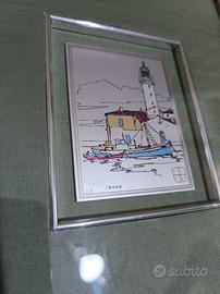 serigrafia su lastra di ottone decorata a mano degli anni '70, di Aldo Riso, numerata 1775/2000. Presenta certificato di autenticità con firma dell'artista. La cornice è originale dell'epoca e presenta imperfezioni come da foto.