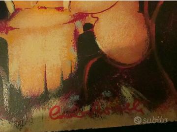 Serigrafia materica a rilievo su carta 50x35cm, realizzata in soli 100 esemplari firmati di pugno dall'artista. Roselli nasce a Milano nel 1939, da giovane si trasferisce prima a Parigi dove si avvicina alla pittura e poi a Londra. Dopo una serie di viaggi per il mondo torna a Roma per dedicarsi ai suoi studi di pittura presso l'Accademia delle Belle Arti nei primi anni 70. Per lui sono state organizzate mostre in tutta Italia e dal 1983 viene proposto anche in Europa con mostre personali a Ginevra, Lucerna, Parigi e Londra. La sua pittura è fatta di personaggi ironici e dinamici che, in chiave moderna, fanno rivivere un certo mondo della pittura impressionista francese, ma in un caldo cromatismo della "Scuola Romana" di Mafai, Sironi, Capogrossi. La pittura di Carlo Roselli è ricca di particolari giochi, carica di individualità nella formazione del magma dove costruisce una sintesi tra il colore, la macchia, la forma e le impressioni, come un'immagine grafica attentamente studiata, eppure immediata e spontanea, netta, chiara nella percettibilità dell'essenziale.