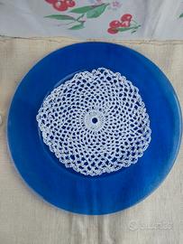 più piatto vassoio in vetro blu diametro cm.33 diametro. centrino di cotone bianco fatto all'uncinetto cm.21 diametro MADE IN ITALY