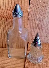 Oliera e spargi sale vetro pressato e metallo argentato. Czechoslovakia.