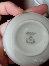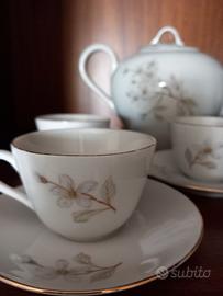 vendo servizio caffè in ceramica Korok bianco con riproduzione di delicati fiori bianchi e filo dorato al bordo tazza d bordo piattino, composto da 5 tazzine , caffetteria e zuccheriera