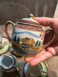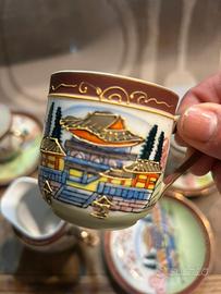 Servizio da tè o caffè vintage in porcellana giapponese. Questo set è caratterizzato da decorazioni dettagliate dipinte a mano che raffigurano scene classiche della cultura giapponese, pagode, paesaggi e figure tradizionali. Porcellana fine dipinta a mano con bordi rossi e finiture dorate, talmente e' sottile la ceramica che sul fondo in controluce si può vedere un'immagine raffigurante il volto di una Geisha. Il timbro