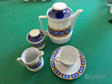 Servizio Caffè Vintage Schirnding Bavaria - Design Pop Art Anni '70 - Space Age Per amanti del vero vintage e del design iconico: propongo un servizio da caffè in porcellana tedesca Schirnding Bavaria, originale degli anni '70. Il set è caratterizzato da un vivace decoro geometrico nei toni del blu cobalto, azzurro e senape, con coperchi in contrasto blu pieno. Le forme sono solide e squadrate, tipiche dell'estetica Space Age del periodo. Composizione del lotto: 1 Caffettiera grande con coperchio blu. 1 Zuccheriera con coperchio coordinato. 1 Lattiera. Tazze e piattini. Un pezzo d'arredo perfetto per una cucina moderna o per chi colleziona porcellane tedesche d'epoca.