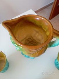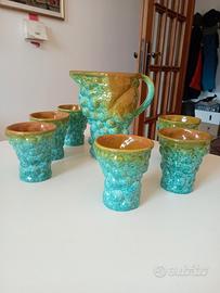 Servizio brocca con sei bicchieri. 3 bicchieri sono perfetti. Brocca e tre bicchieri presentano piccoli difetti. Proprio perché non perfetto vendo a prezzo interessantissimo. Il pacco supera i 2 kg