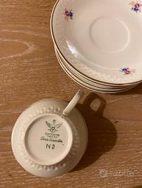 Si tratta di un set di 6 tazzine,6 piattini, teiera e latteria/zuccheriera in porcellana di Fontebasso Treviso, vintage e da collezione.