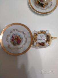 Fate un salto indietro nel tempo con questo incantevole servizio da caffè vintage in porcellana, decorato con romantiche scene ispirate a Fragonard e una delicata doratura in oro spazzolato. Probabile primi del '900