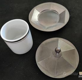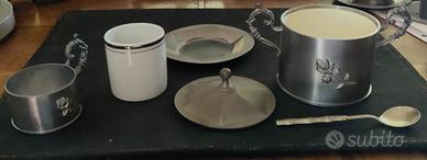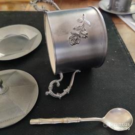 COMPLETA IL SERVIZIO, UNA ZUCCHERIERA IN CERAMICA CONTENUTA IN UN BASAMENTO IN PELTRO , CON COPERCHIO E CUCCHIAINO IN PELTRO