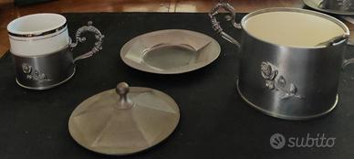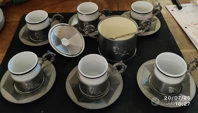 SERVIZIO DA CAFFE' ANNI 70 COMPOSTO DA 6 TAZZE IN CERAMICA DECORATA CONTENUTE IN 6 BASI IN PELTRO CON MANICO E ROSA IN