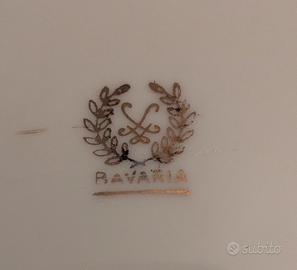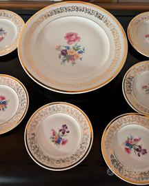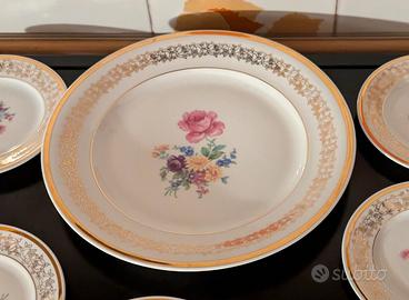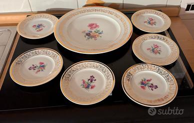 Servizio da dolce anni 50 composto da 6 piattini e 1 piatto da torta Bavaria con bordi lavorati in oro e motivi floreali, perfetti.
