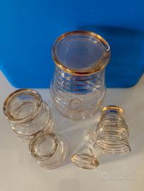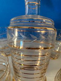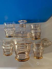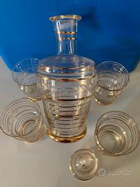 Servizio da liquore vintage stile Art Déco, composto da una caraffa con tappo e quattro bicchieri, caratterizzato da decorazioni orizzontali a strisce dorate e un motivo a foglie inciso sul vetro. 1 Caraffa, compreso il tappo, altezza cm. 28, circonferenza max 34 cm 4 Bicchieri altezza 8 cm. – diametro 7 cm. Set risalente agli anni '60. Peso complessivo 953 gr. (Caraffa circa 523 gr. + 4 bicchieri 428 gr.) Per ulteriori informazioni non esitate a contattarmi