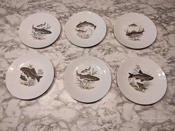 Bellissimo servizio di piatti da pesce della marca Khala german democratic republic , in porcellana bianca. Il servizio comprende 7 piatti decorati con immagini di pesci. Sono in ottime condizioni, perfetti per una cena elegante. - 6 piatti piani diametro cm. 24- 1 piatto da portata ovale cm. 23 x 38. Valuto offerte. Preferito ritiro diretto.