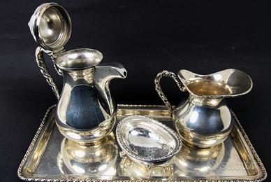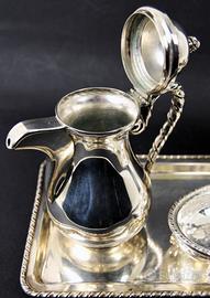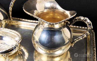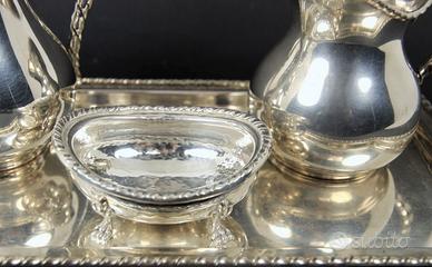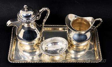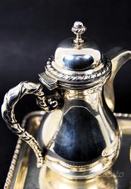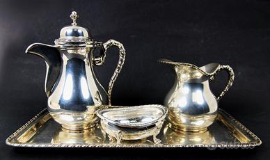 Originale e vecchio servizio da te o caffè, in argento 800 massiccio, composto da teiera, lattiera, zuccheriera e vassoio in stile San Marco.